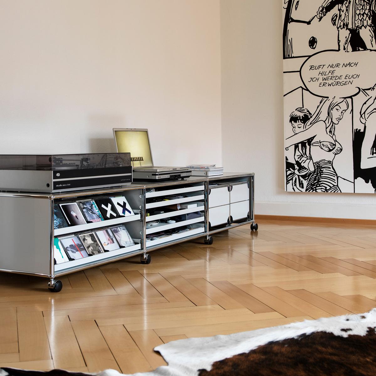 Flexibel nutzbar: USM Haller HiFi-Lowboard mit Rollen und praktischen Einschüben für DVDs