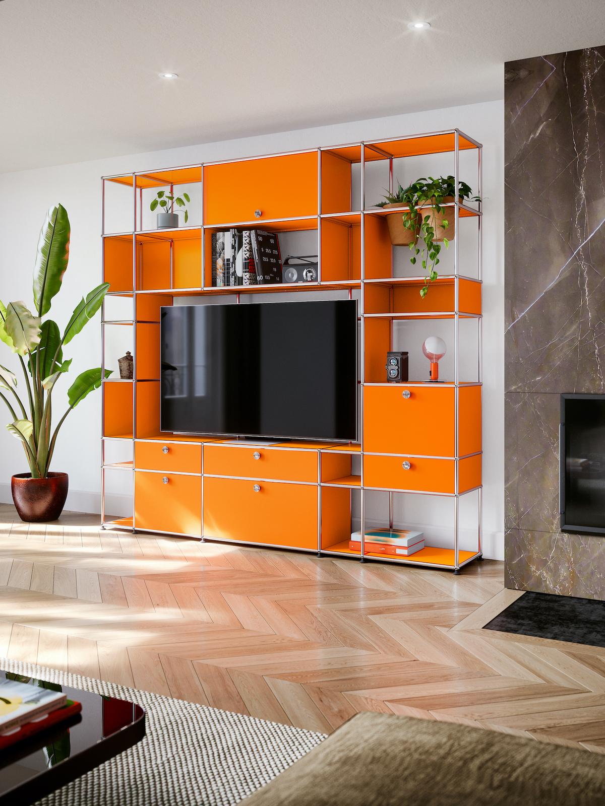 Individuell konfiguriertes USM Haller TV-Möbel mit viel Stauraum und USM Haller Tablaren für Topfpflanzen
