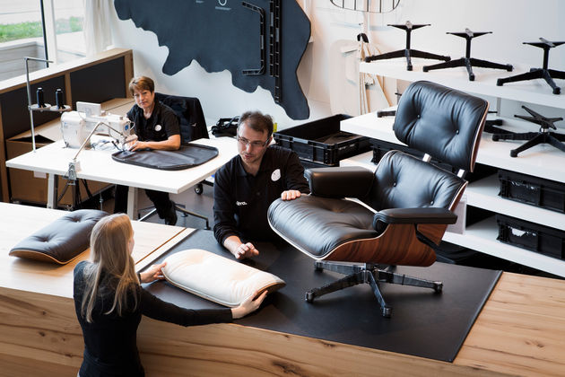 Im Lounge Chair Atelier auf dem Vitra Campus kann beobachtet werden, wie der Eames Lounge Chair gefertigt wird.