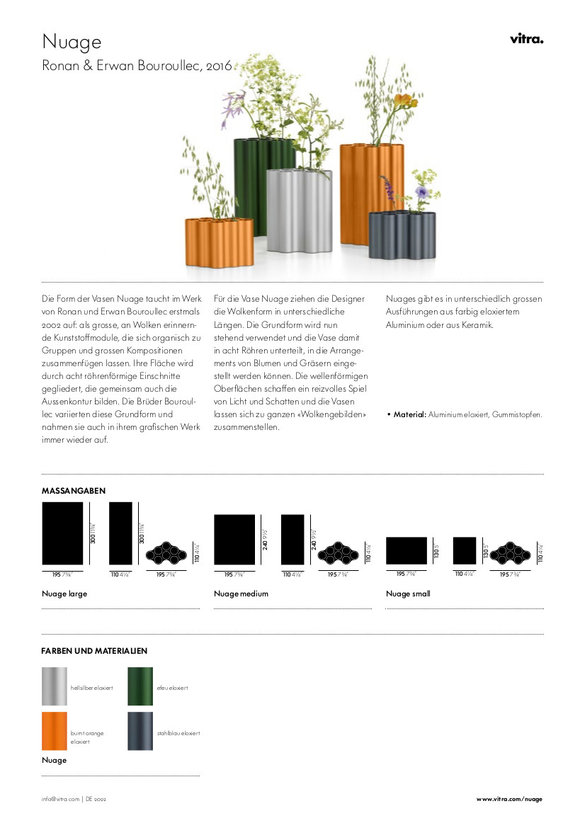 Die Nuage Vasen von den Designerbrüdern Ronan & Erwan Bouroullec für den Hersteller Vitra erinnern in ihrer Form an Wolken (frz.: "nuages"). Jede Vase ist in 8 Röhren unterteilt, in welchen einzelne Blumen oder Gräser arrangiert werden können. Die in verschiedenen Materialien, Größen und Farben erhältlichen Designvasen lassen sich individuell miteineinader kombinieren, wodurch vielseitige skulpturale Wolkengebilde entstehen.