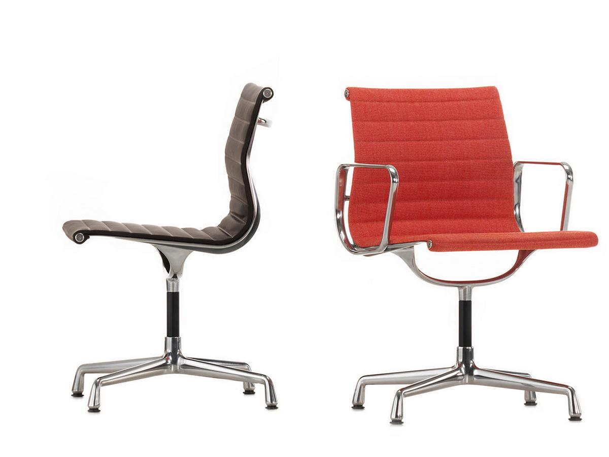 Alle drei Vitra Konferenzstühle basieren auf einem Viersternfuß und sind nicht höhenverstellbar. Im Gegensatz zu den Modellen EA 105 / EA 107 und EA 108 zeichnen sie sich durch eine schmalere, kürzere Sitzfläche aus. Der EA 101 ist hierbei nicht drehbar und hat keine Armlehnen, die Ausführung EA 103 ist nicht drehbar, verfügt jedoch über Armlehnen und der EA 104 lässt sich drehen und hat Armlehnen. Wählt man die Stühle mit Lederbezug, ist die Rückenlehne mit dem Stoff Plano bezogen, eine Lederrückenlehne ist gegen Aufpreis möglich.