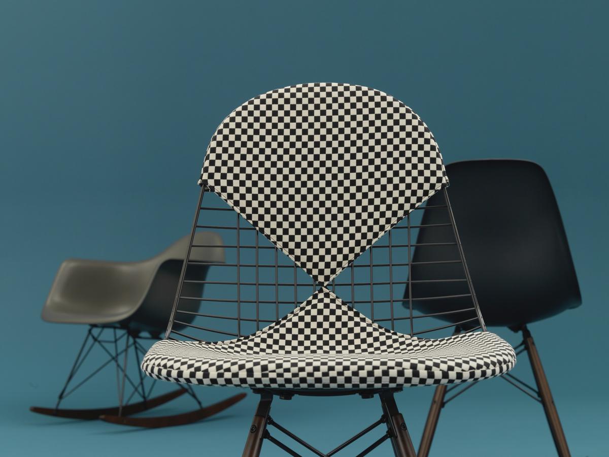 Charles & Ray Eames experimentierten einige Jahre mit Materialien wie Formsperrholz und Aluminium, bevor sie 1951 schließlich ihre Wire Chair Serie vorstellten – ein Jahr nach dem Erscheinen ihrer legendären Plastic Chairs, deren Schale damals aus Fiberglas gefertigt war. Bei den Wire Chairs wie dem DKW wiederum bestehen Sitz- und Rückenfläche aus einem ausgeklügelten System aus gebogenem und verschweißtem Stahldraht. Längst ein Designklassiker, ist der DKW mit seinem Holzuntergestell dabei äußerst komfortabel, gerade auch mit seinem markanten Bikini-Sitzkissen, welches den Vitra Stuhl noch gemütlicher und vielseitiger macht. Hier ist die Kombination aus Holz, Metall und Stoff immer wieder aufs Neue spannend, sei das nun mit einem Polster in skandinavisch-schlichtem Eisblau oder in der frecheren Checker-Version, die, wie der Name schon sagt, an ein Schachbrett erinnert.