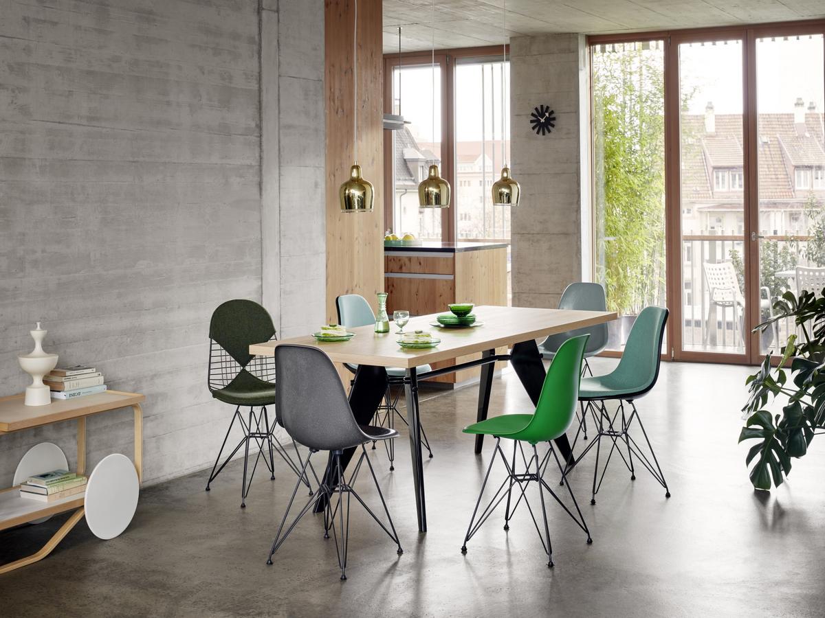 Eames Wire Chairs mit leichtfüßigem Gitternetzmuster in leuchtendem Ambiente: Vitra DSR, Vitra DKR Wire Chair und Vitra Eames DAR