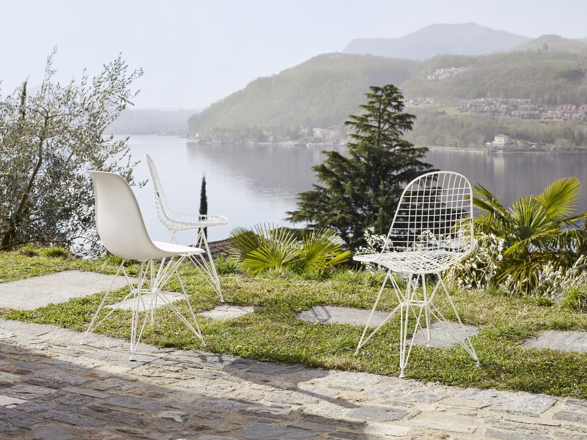 Outdoor-Stühle von Vitra: Durch Pulverbeschichtung für den Garten geeignet, wie hier der Vitra DSR in vielen bunten Farben neben dem Vitra DKR Wire Chair