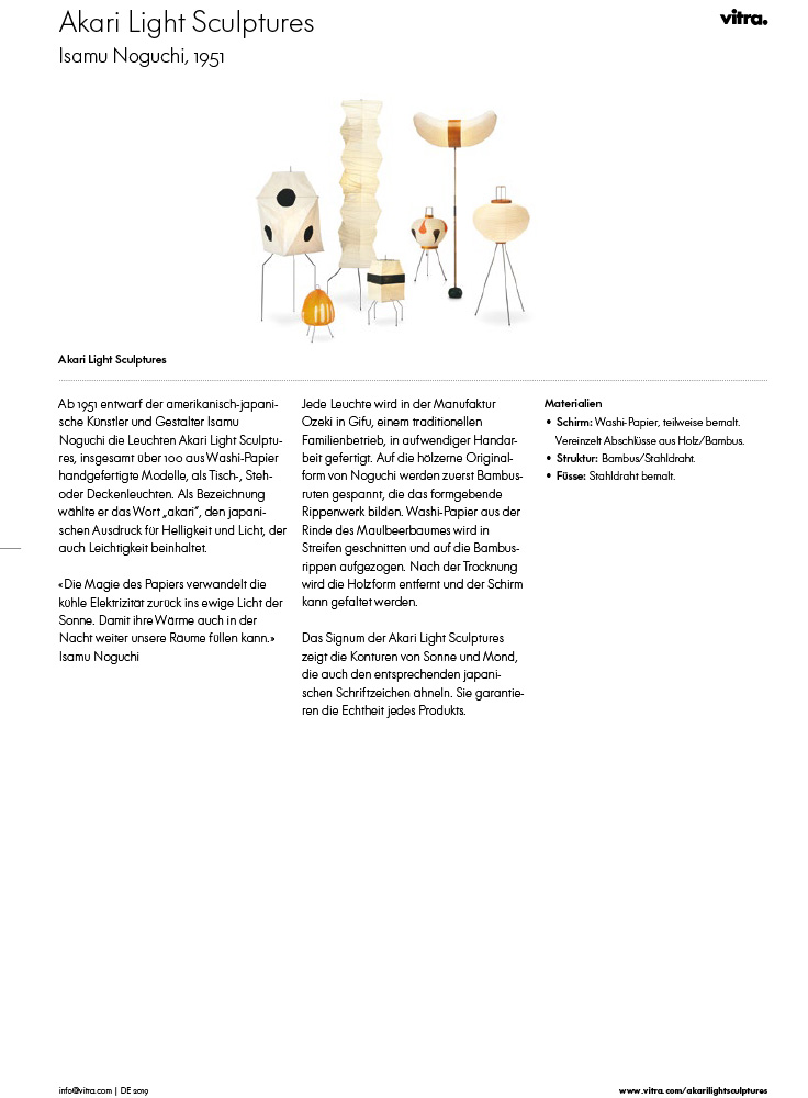 ...Sein bekanntestes Werk sind unbestreitbar die Akari Leuchten... Vor den Akari Light Sculptures entstand jedoch eine andere Leuchte, die vielleicht viel besser zu Isamu Noguchi und in den Kontext seiner Kunst passt...