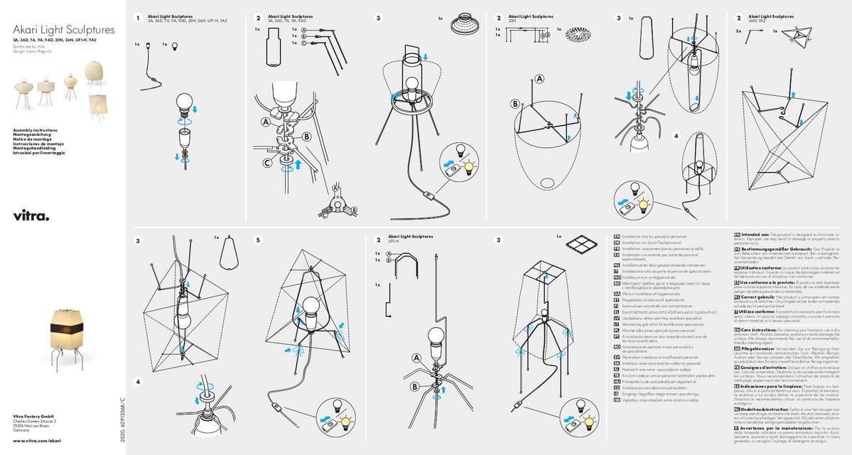 | Funktion & Eigenschaften | E27-Fassung, max. 40 W Mit Schnurschalter Vitra empfiehlt, das mitgelieferte Leuchtmittel zu verwenden, da dieses Leuchtmittel vom Hersteller getestet und freigegeben wurde. Für Schäden am Papier oder der Elektrifizierung, die durch die Verwendung eines anderen Leuchtmittels entstehen, übernimmt Vitra keine Haftung. |