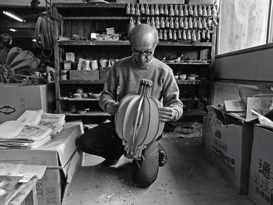 Designer Isamu Noguchi bei der Gestaltung einer Akari Leuchte
