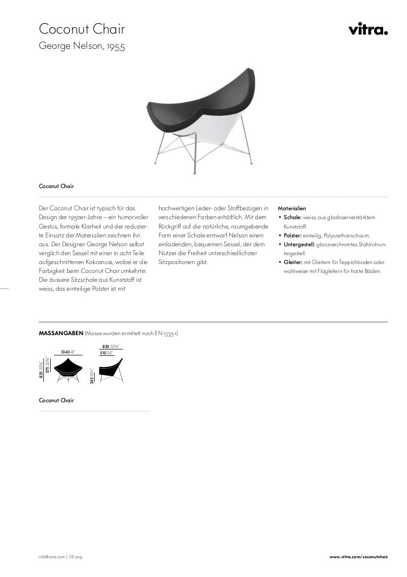 Das Design des Coconut Chairs entwickelte George Nelson Mitte der 50er Jahre. Es integriert die charakteristischen Merkmale des damaligen Designstils: Klare Formen treffen auf gekonnt eingesetzte Materialien und machen zusammen einen echten Klassiker amerikanischen Nachkriegsdesigns. Nelson wollte mit der aus glasfaserverstärktem Kunststoff gefertigten und mit Polyurethanschaum gepolsterten Sitzschale formal ein Stück Kokosnuss nachbilden - der Produktname spricht hier für sich. George Nelson entwickelte noch viele weitere Designs, die das Lebensgefühl der 50er Jahre prägten und so bis heute als charakteristische Vertreter des Mid-Century-Modern gelten. Viele von ihnen sind heute über den Schweizer Möbelhersteller Vitra erhältlich.