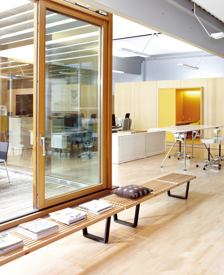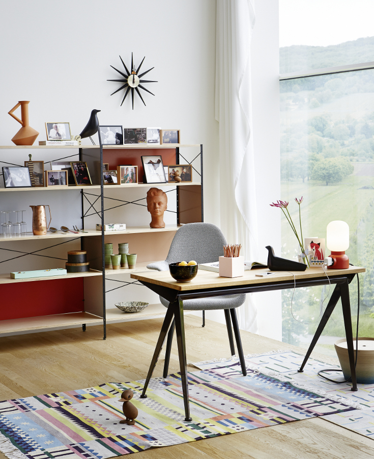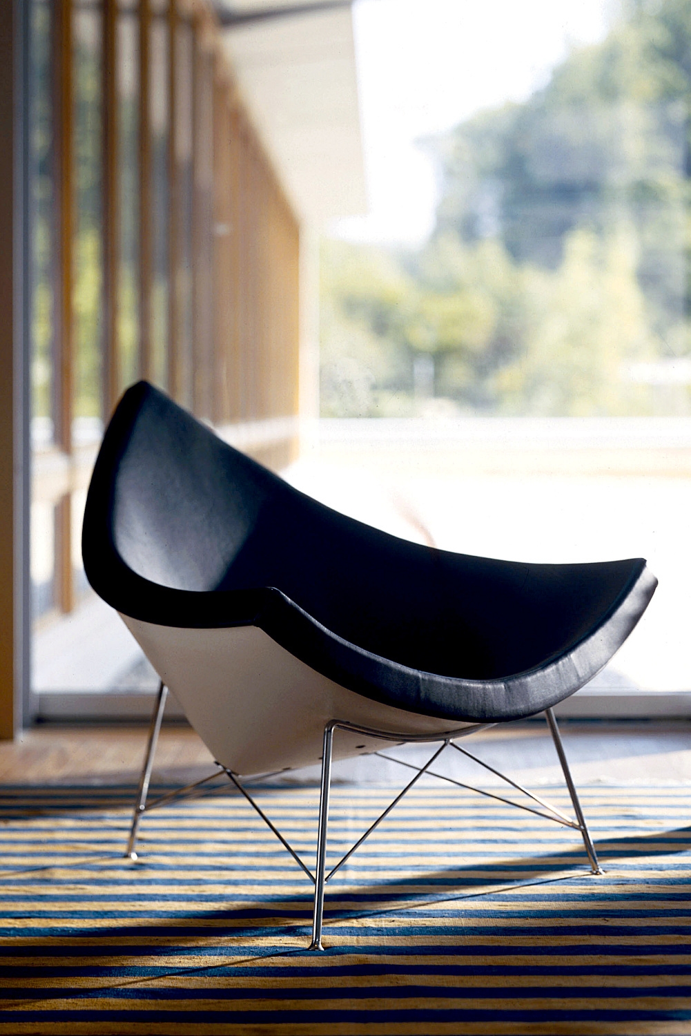 George Nelson, einer der großen Designer der amerikanischen Nachkriegsmoderne, prägte den Begriff Mid-Century-Design ganz entscheidend. Während er eine Zeit lang in Rom lebte, machte er sich mit der klassischen Moderne vertraut, was sein Schaffen seither stets beeinflusste. Er arbeitete ab den 1940er Jahren im eigenen Designbüro und entwarf hier beispielsweise 1946 die Nelson Bench, welche inzwischen von Vitra hergestellt wird. Bei der Nelson Bench wird Nelsons Interesse für architektonische Formen und Techniken sehr deutlich. Unter anderem in seiner Rolle als Kreativdirektor des amerikanischen Möbelherstellers Herman Miller pflegte er regen Kontakt zu weiteren Designgrößen des 20. Jahrhunderts, etwa Alexander Girard oder Charles und Ray Eames, deren Designs für Europa heute ebenfalls von Vitra produziert werden. Auch der deutlich an ein Stück einer Kokosnuss erinnernde Vitra Coconut Chair, bestehend aus einem Untergestell aus verchromten Stahlrohr und einer gepolsterten Sitzschale, stammt aus George Nelsons Feder und entspricht deutlich dem Stil des Mid Century Modern. Farbenfroher kommt Nelsons Marshmallow Sofa daher, welches wesentlich mehr in die Richtung des Pop Art Design geht und das Möbelgenre der damaligen Zeit neu interpretierte. Es besteht aus einer Stahlstruktur und 18 runden, bunten Kissen, die ihrer Optik wegen namensgebend für das Möbel waren. Ein weiteres Möbel, welches die Vielfalt von Nelsons Designs deutlich macht, ist sein Home Desk, den er 1958 entwarf und der sehr reduziert gestaltet ist, jedoch durch bunte Kunststofftrennwände und seine schlanken Beine immer noch zeitgemäß Akzente im Wohn- und Arbeitsbereich setzt.