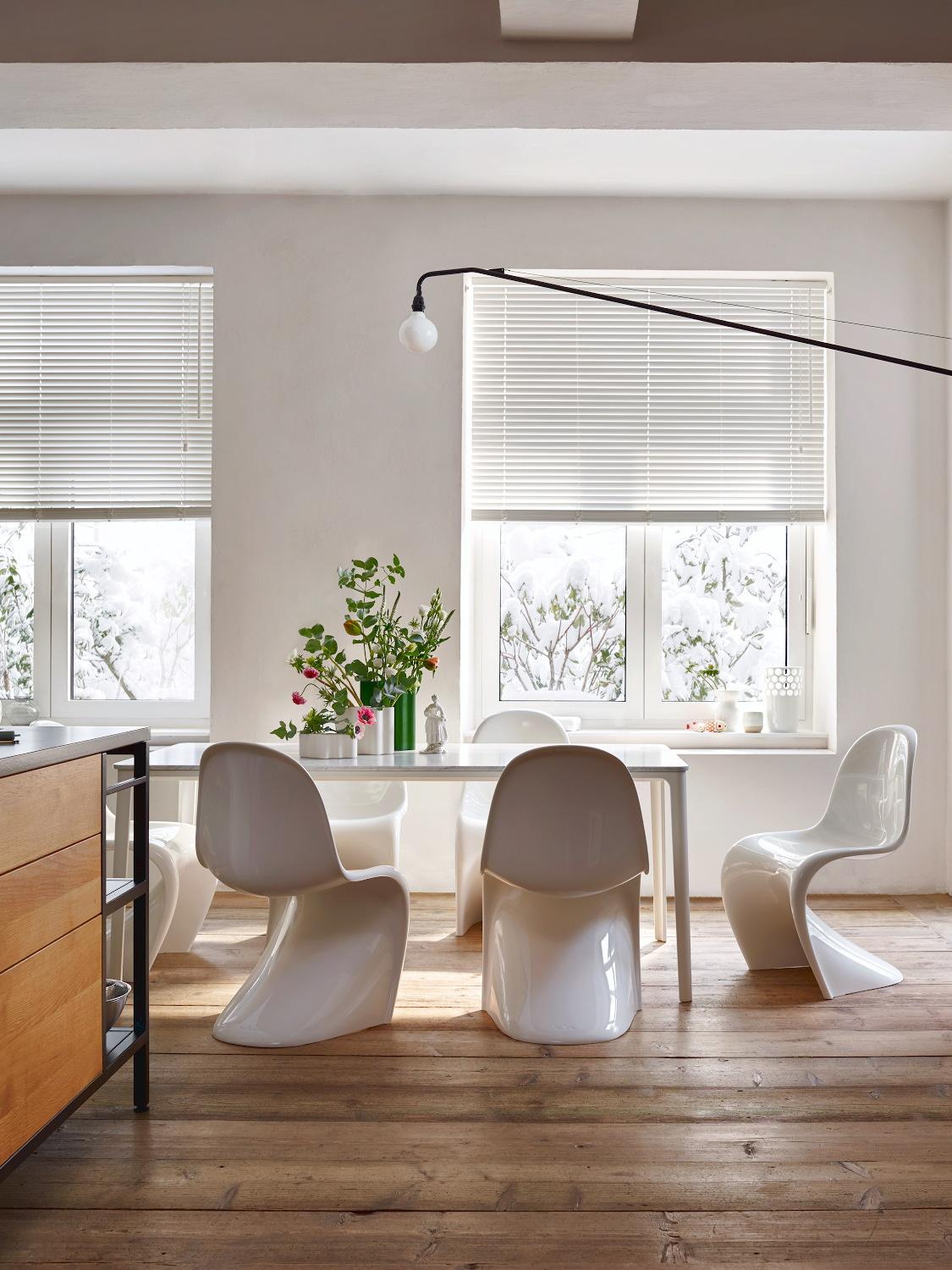 Der Designklassiker wird seit 1990 unter dem Namen Panton Chair Classic wieder aus dem ursprünglichen und zuverlässigen Vollkunststoff mit Hochglanzlackierung durch Vitra vertrieben. Zuletzt autorisierte Verner Panton eine Version mit matter Oberfläche aus durchgefärbtem Polypropylen, die endlich die beste Qualität zu einem günstigen Preis ermöglicht. Außerdem entwickelte Vitra eine Juniorversion des beliebten Kunststoffstuhls in kindgerechten Farben und Proportionen, den Panton Junior. Aber in welcher Form auch immer - der ergonomische Freischwinger mit seiner einzigartig konkaven Wölbung ist legendäres Wahrzeichen der 1960er-Jahre und moderner Stilgarant zugleich.