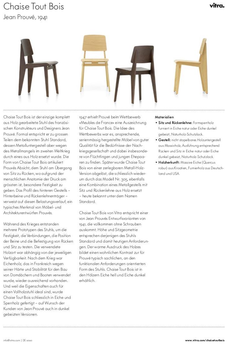 Designliebhaber müssen beim Chaise Tout Bois von Vitra nicht lange überlegen, aus wessen Feder der Midcentury Stuhl stammt - typisch Jean Prouvé eben. Der Wiedererkennungswert des verstärkten hinteren Gestells ist enorm und drückt das Verständnis des französischen Designers und Konstrukteurs für Funktionalität und Festigkeit aus. Es handelt sich um den einzigen komplett aus Holz gearbeiteten Jean Prouvé Stuhl, der aufgrund des Metallmangels im zweiten Weltkrieg geschickt auf diesen Werkstoff verzichtete.