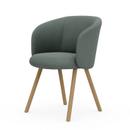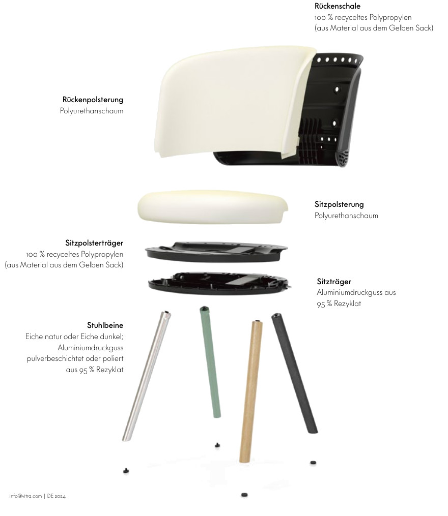 | Material | Rückenlehne und Sitz: Schale aus recyceltem Post-Consumer-Polypropylen, Sitz- und Rückenpolster aus Polyurethanschaum Sitzplatte: Aluminiumdruckguss Untergestell: Eichenholz (Quercus Robur aus Tschechien), wahlweise natur oder dunkel gebeizt oder Aluminium, wahlweise poliert oder schwarz bzw. kreidefarben pulverbeschichtet. |