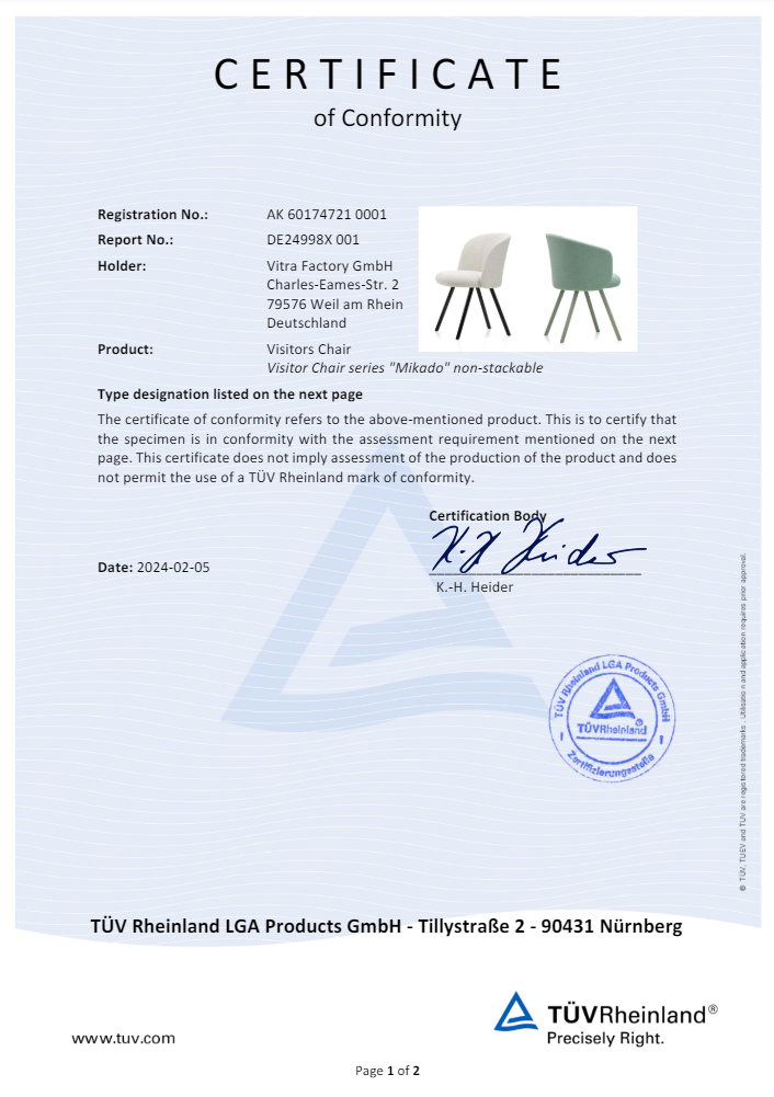 | Zertifikate | Für Vitra gilt: ISO 9001: 2008 (Qualitätmanagementnorm) ISO 14001: 2004 (Umweltmanagementnorm) Um Vitras Compliance-Zertifikat einzusehen, klicken Sie bitte auf das Bild: ![]() Für die Mikado Stühle gilt: |