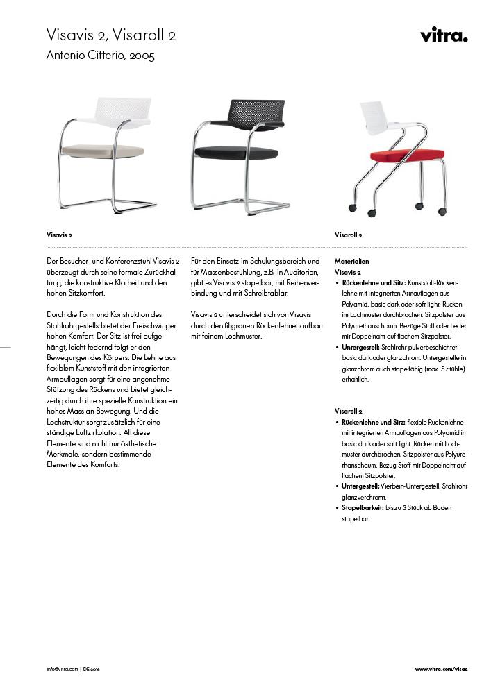 Der Vitra Stuhl Visavis 2 von Antonio Citterio eignet sich optimal als Konferenz- oder Besucherstuhl und ist zudem in einer stapelbaren Variante erhältlich, sodass er sich platzsparend verstauen lässt. Die Kombination aus Freischwingergestell, Polsterung und Armlehnen sorgt für einen hohen Sitzkomfort.