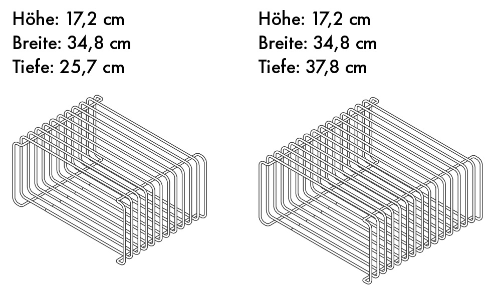| Funktion & Eigenschaften | Drahtregale können mithilfe von Clips miteinander verbunden und beliebig erweitert werden |